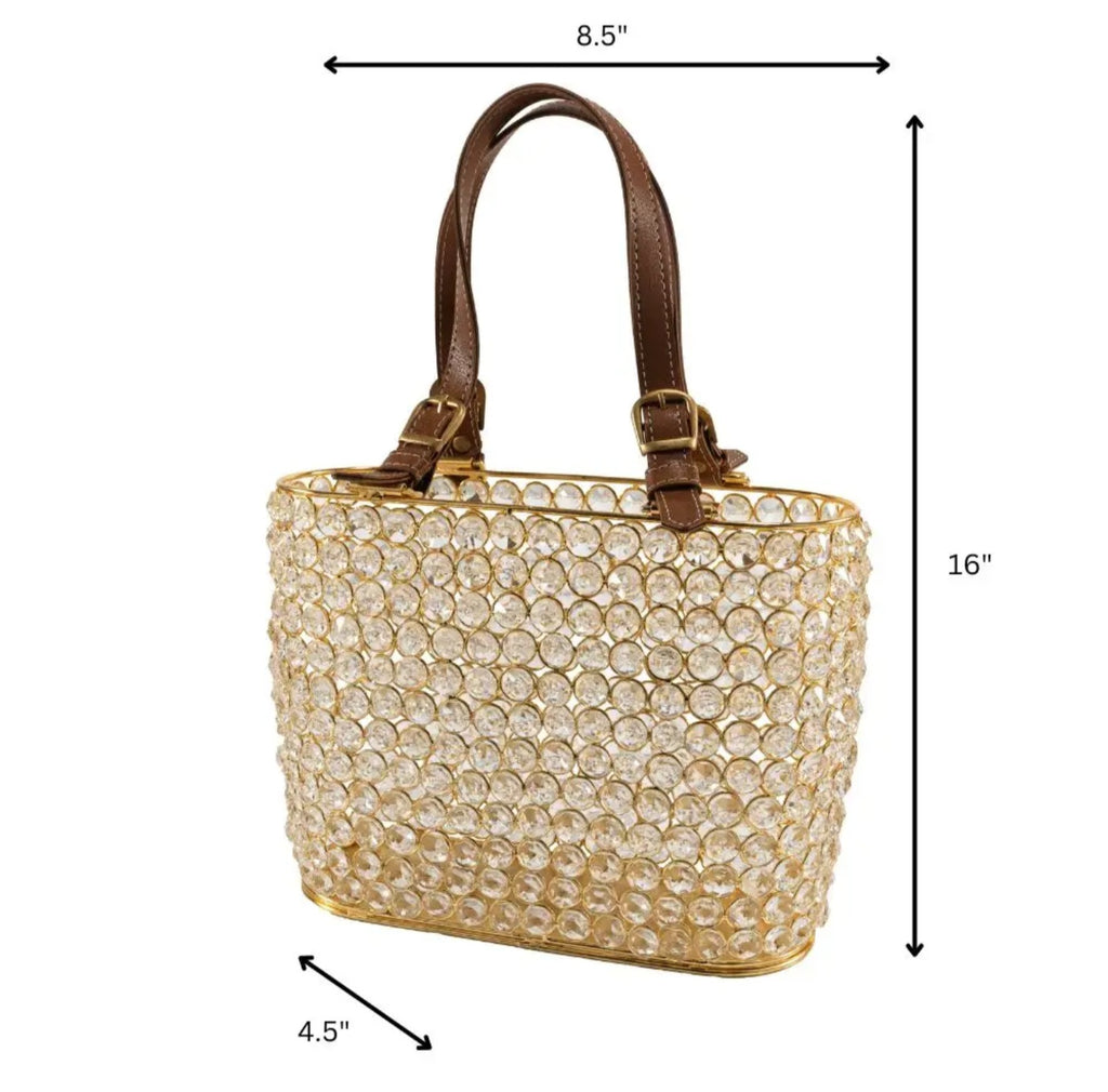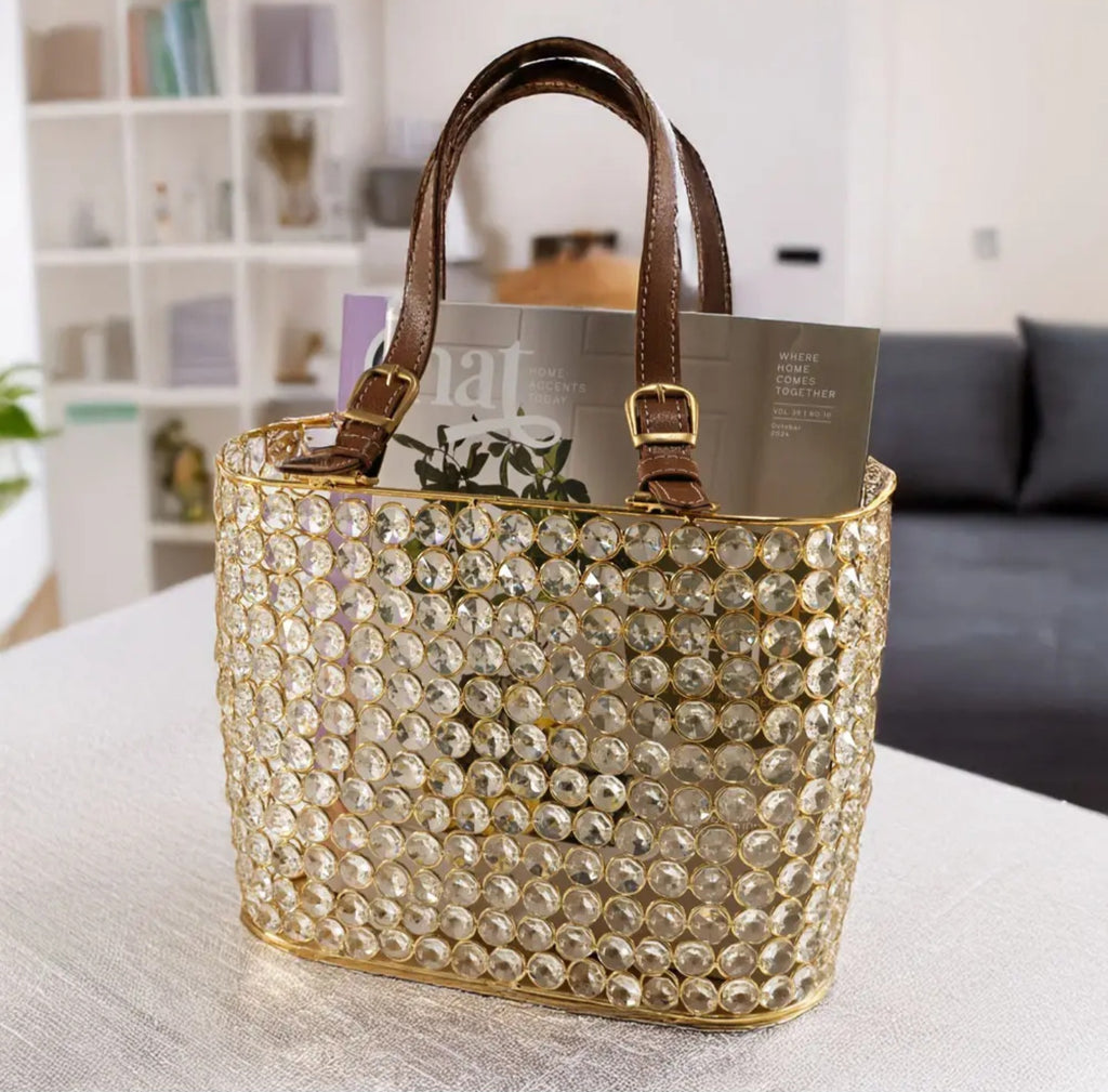 This unique and versatile piece is perfect for organizing magazines, mail, or documents while adding a glamorous flair to any room. Whether placed in your home office, living room, or entryway, this Gold and Cristal Tote combine practical storage with sophisticated style.