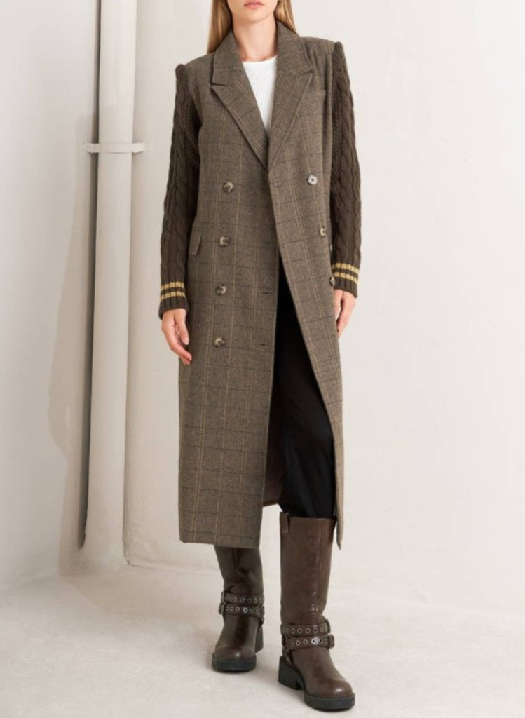 Elevate your outerwear collection with this sophisticated longline coat featuring classic pinstripe detailing and luxe contrast sleeves. The double-breasted silhouette creates a timeless, tailored look while the extended length offers elegant coverage and warmth.