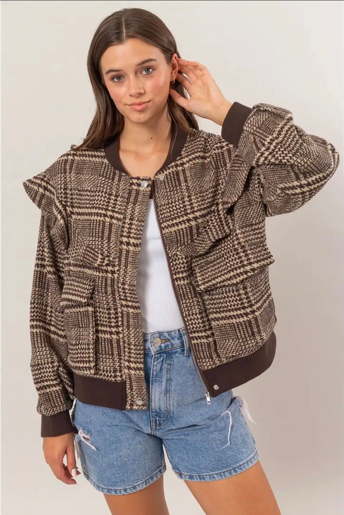 Elevate your outerwear collection with this timeless houndstooth bomber jacket that effortlessly blends vintage charm with contemporary style. The classic brown and cream check pattern creates a sophisticated look that pairs perfectly with any casual ensemble.